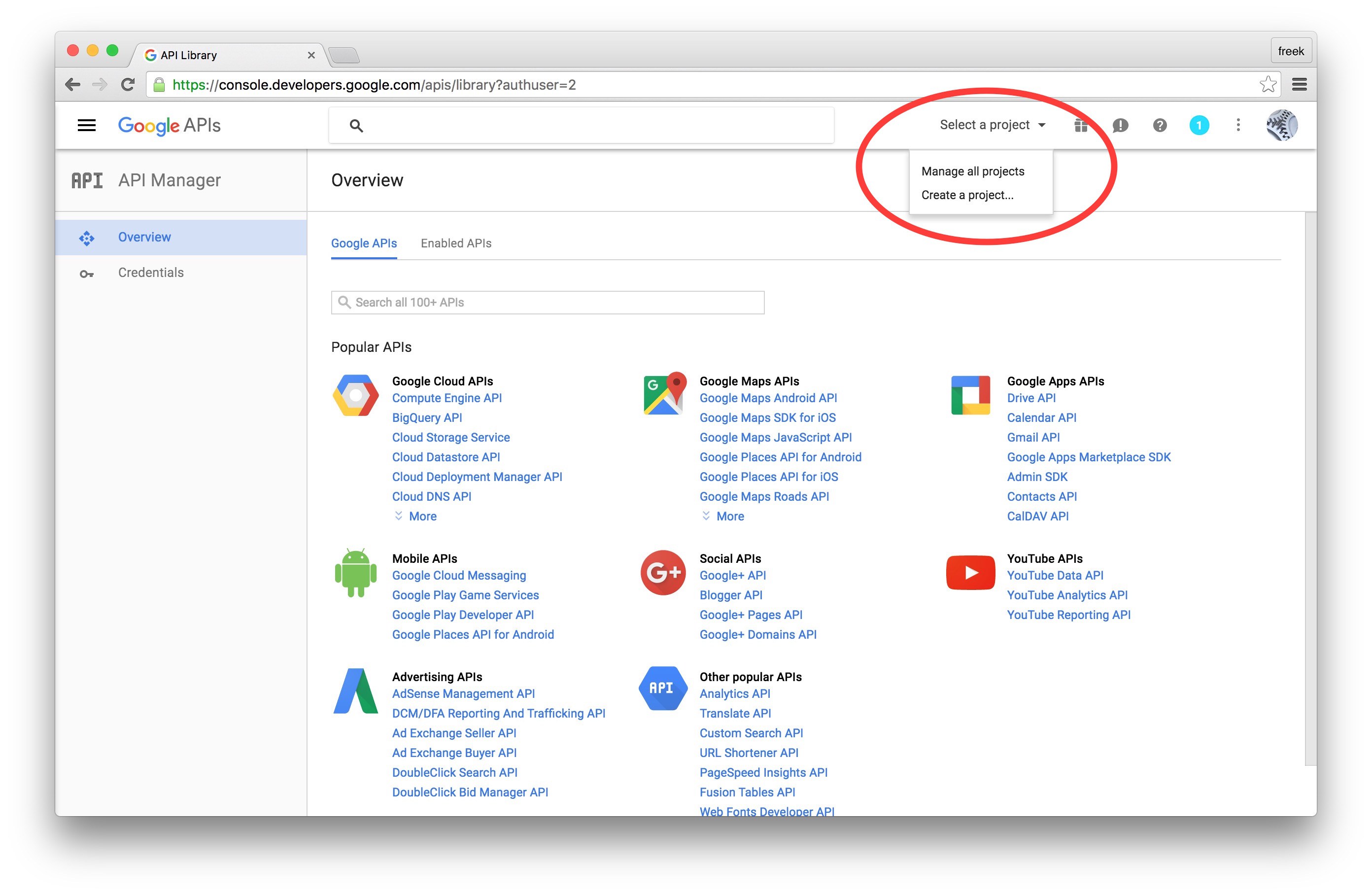 The first thing you’ll need to do is to get some credentials to use Google API’s. I’m assuming that you’ve already created a Google account and are signed in. Head over to Google API’s site and click "Select a project" in the header.