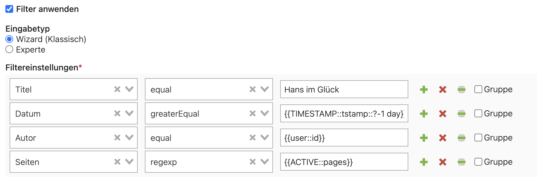 In der Listenansicht und in einigen anderen Modulen gibt es ein Widget für den Filter. Siehe Screenshot. Vereinfacht gesagt kannst du in diesem Widget die Werte eintragen, nach denen du filtern möchtest, entweder als "Klartext" oder "Inserttag". Achte darauf, dass der Feldwert, der tatsächlich in der Datenbank gespeichert ist, mit dem abgefragten Wert übereinstimmt. Außerdem beachte den Operator, der grundsätzlich gilt: