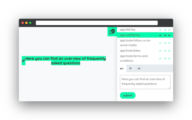 This has been done by an inline "widget" that can be collapsed. If open, this visualizes the keys and (already defined) translations that can be found on the page for every language that has been configured within the application.