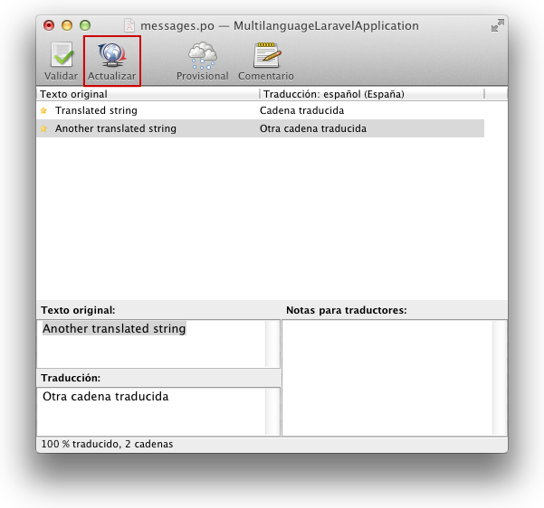 Once Poedit is loaded press the Update button to load all localized strings. You can repeat this step anytime you add a new localized string.