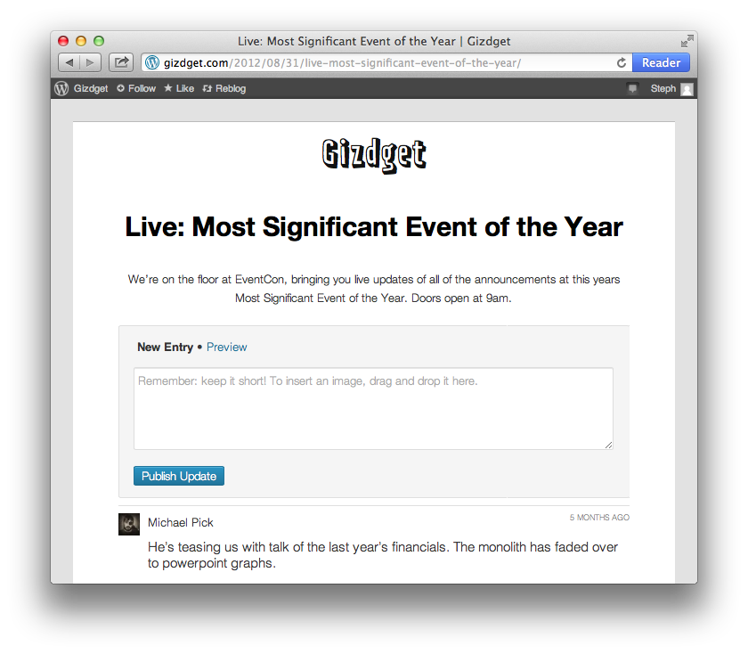 To post to the liveblog, navigate to the live post, and start typing. Click "Publish Update," and your readers will see the post appear at the top of their screen. That's all there is to it.