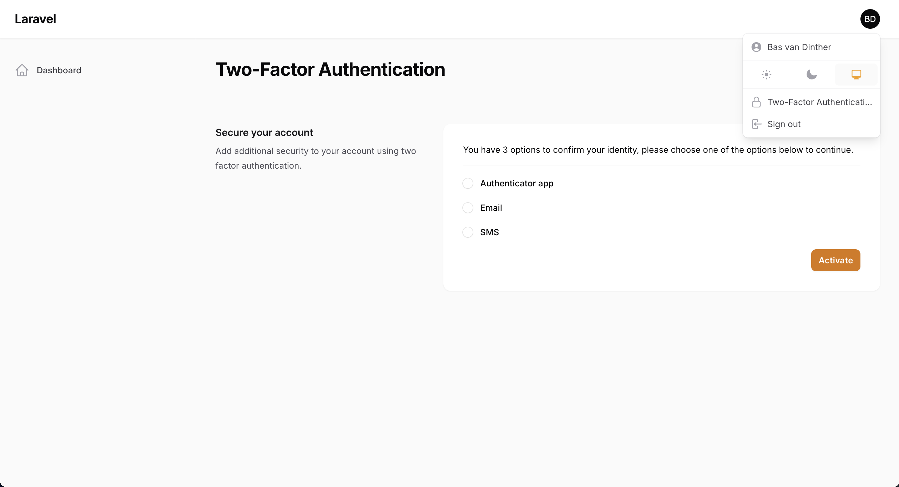 If you used Laravel Fortify before, you probably already have users with 2FA enabled. In that case, you should let the install command set the default two_factor_type for existing users. Else you may run into issues.