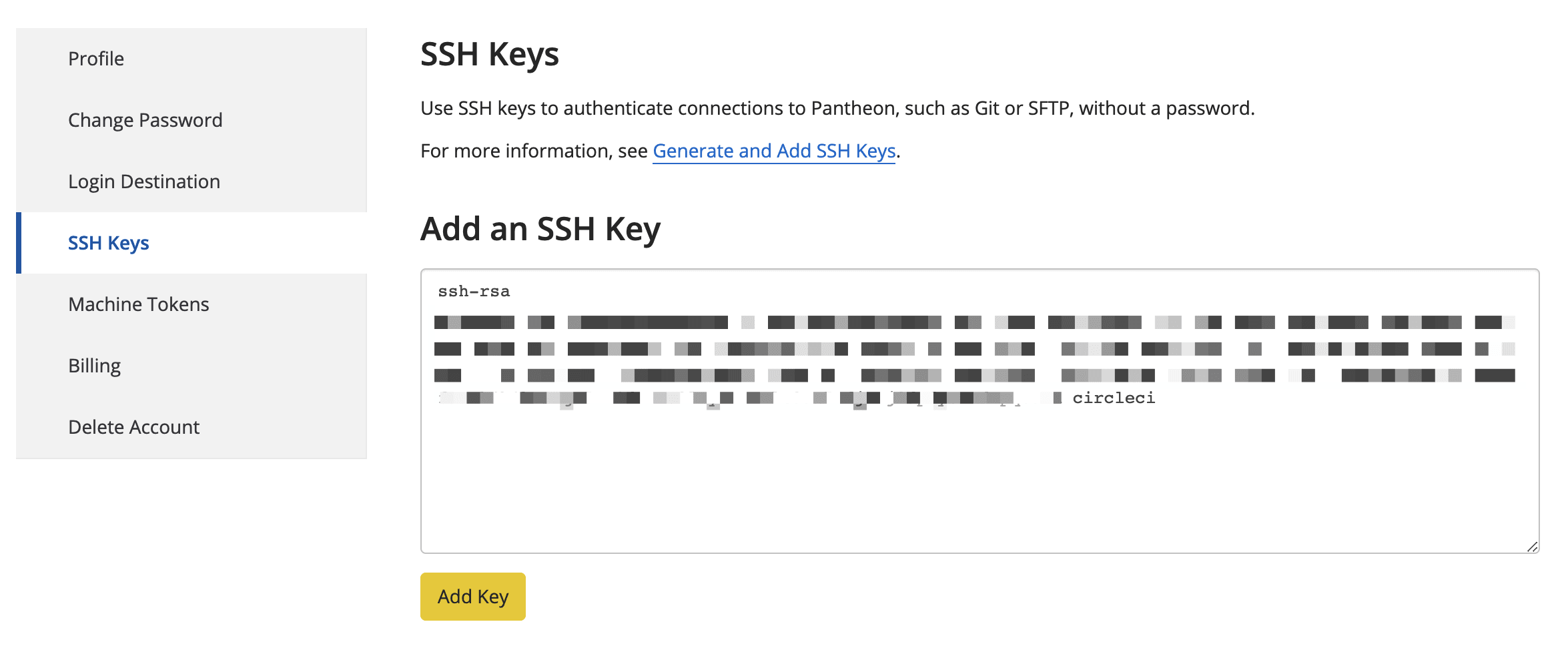 There you want to go to the SSH Keys section and fill the Add an SSH Key