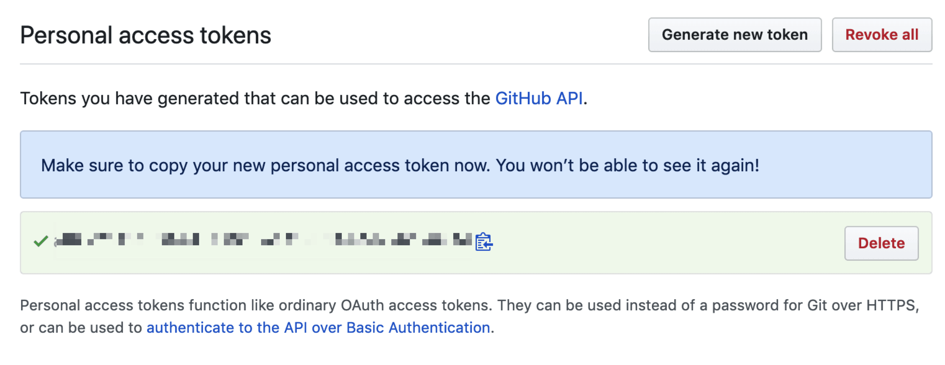 Once created, GitHub will only show your personal token once. You can save it