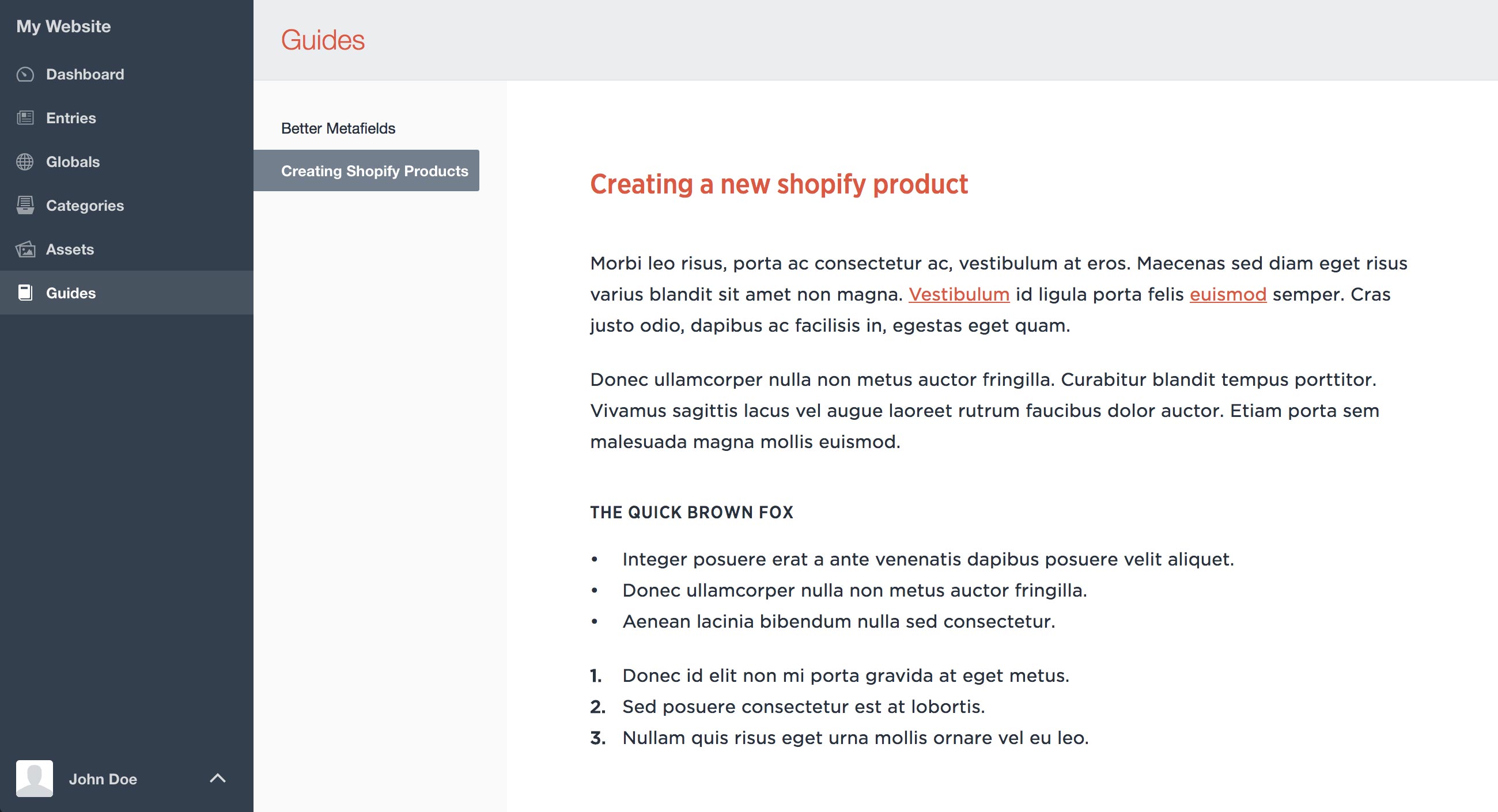 Guidessection. - Create a new Guides entry, save it, then click Guides in the Craft sidebar nav. You should see your new content.