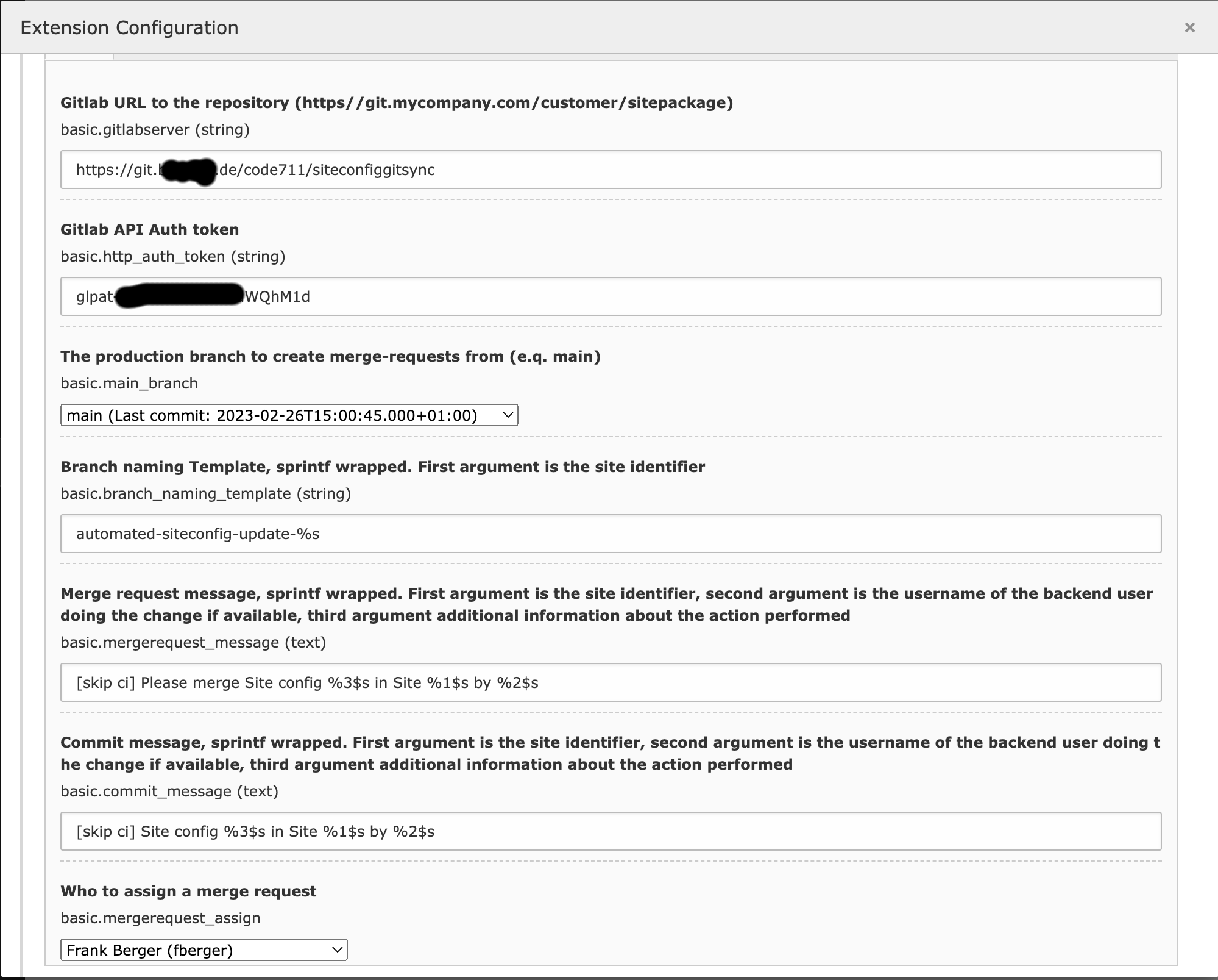 Now press the "Save 'siteconfiggitsync' Configuration" button, and close the window. Re-open the window and navigate again to the siteconfiggitsync accordion and open it. The fields 'main_branch' and 'Who to assign a merge request' should be filled with respectively the available branches in that project and members who are allowed to merge merge-requests.