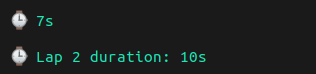 $this->lap(); $this->lap(true, ['prepend_text' => 'Lap {lap_number} duration: ']);