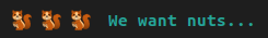 $this->zoo("We want nuts...", [ 'color' => 'teal_light_1', 'icons' => ['squirrel', 'squirrel', 'squirrel'], 'bold', ]);