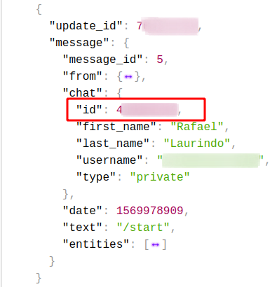 1. Search for the chat that you want to send messages, and get the chat->id: