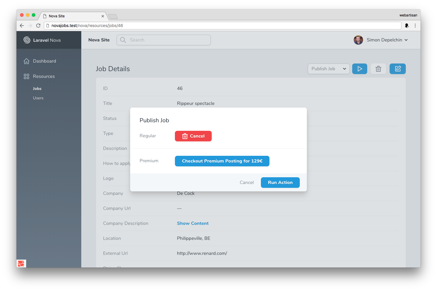 \\ app\Nova\Actions\PublishJob.php \\ use Depsimon\NovaStripeCheckoutField\NovaStripeCheckoutField; public function fields() { return [ NovaStripeCheckoutField::make('Regular', 'regular_token') ->amount(9999) ->currency('eur') ->company('Nova Jobs') ->description('Regular Job Posting for 60 days') ->label('Checkout Regular Posting for 99€'), NovaStripeCheckoutField::make('Premium', 'premium_token') ->amount(19999) ->currency('eur') ->company('Nova Jobs') ->description('Premium Job Posting for 60 days') ->label('Checkout Premium Posting for 129€'), ]; }