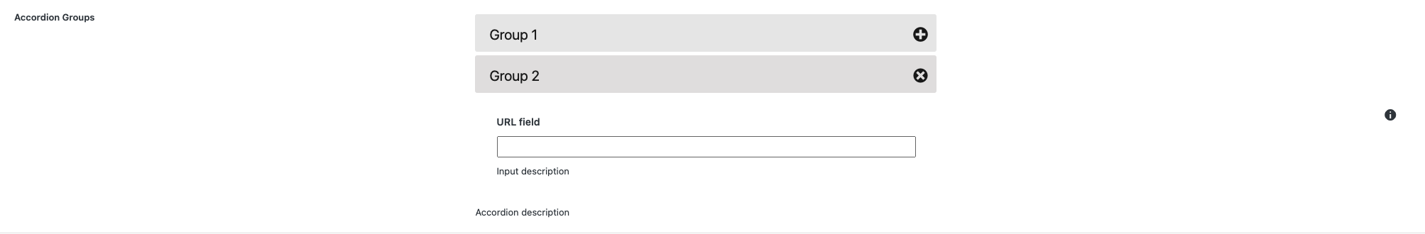 [ 'id' => 'accordion', // group id 'type' => 'accordion', // group type 'title' => _x( 'Accordion Title', 'options', PREFIX ), // group title 'options' => [ //group 1 [ 'title' => _x( 'Group 1', 'options', PREFIX ), 'options' => [ // add here other option fields ] ], //group 2 [ 'title' => _x( 'Group 2', 'options', PREFIX ), 'options' => [ // add here other option fields ] ] ], 'attr' => array( 'class' => 'custom-class', 'data-foo' => 'bar' ), // custom attributes added to the group 'description' => _x( 'Accordion description', 'options', PREFIX ), // group description 'tooltip' => _x( 'More description in tooltip', 'options', PREFIX ), // group tooltip 'divider' => true // add a border at the bottom ]