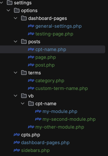 [ "paths" => [ "plugin-settings-folder" => "", // folder where are all the settings located - default empty and without it, nothing will be enabled "options" => [ "dashboard-pages-options-folder" => "options/dashboard-pages/", // the folder where the dashboard menu options are located "post-types-options-folder" => "options/posts/", // the folder where the posts and custom posts options are located "terms-options-folder" => "options/terms/", // the folder where the terms and categories options are located "vb-modal-options-folder" => "options/vb/", // the folder where the visual builder modals options are located ], "features" => [ "dash-menus-settings-file" => "dashboard-pages.php", // the file where the dashboard menus settings are located "cpts-settings-file" => "cpts.php", // the file where custom posts creation settings are located "sidebars-settings-file" => "sidebars.php", // the file where custom sidebars creation settings are located ], ], "features" => [ "vb-register-on-post-types" => [], // on what post types to enable the visual builder, default none "enable-dynamic-sidebars" => false, // enable the dynamic sidebars form creation, default no ] ]