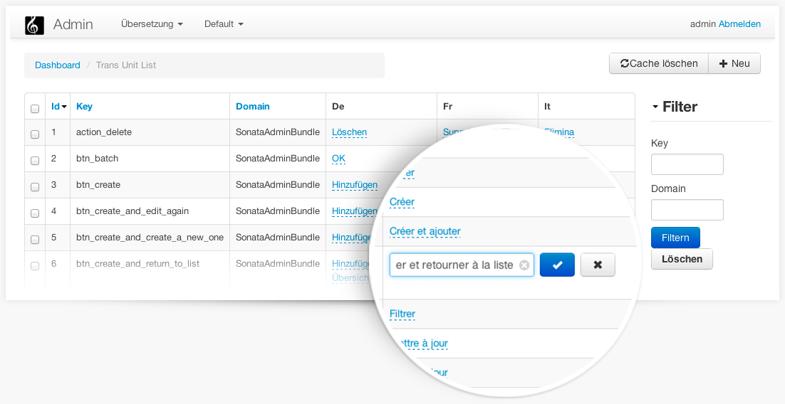 The SonataTranslationBundle is an integration of the LexikTranslationBundle into the SonataAdminBundle.