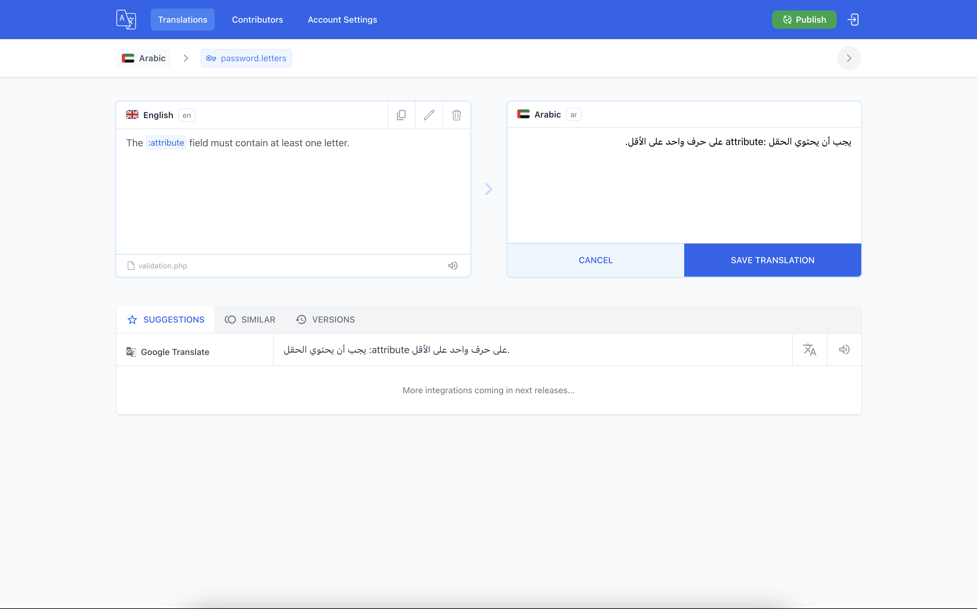 Laravel Translations UI package provides a user-friendly interface for managing translations in your Laravel application. It simplifies tasks such as adding, editing, deleting, and exporting translations. The package also includes a handy search feature and the ability to invite collaborators for easy translation management. Currently, the package is integrated with the Google Translate API, allowing you to translate your content into any language of your choice.