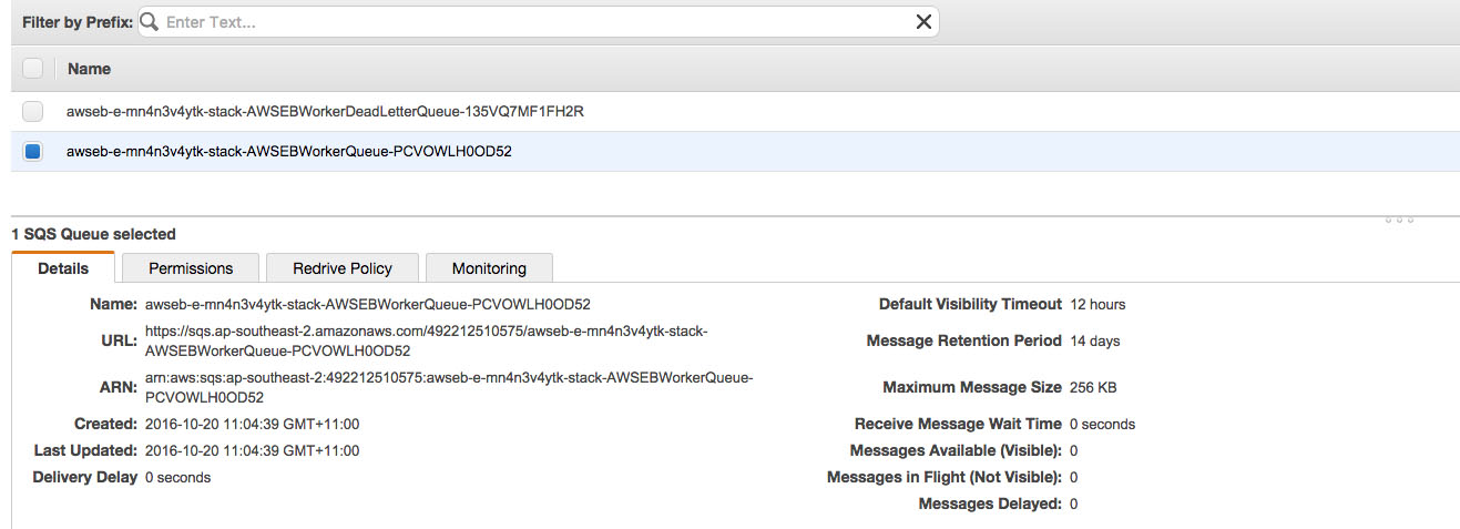 Don't forget to set the HTTP path to /worker/queue – this is where AWS will hit our application. If you chose to generate queues automatically, you can see their details later in SQS section of the AWS console: