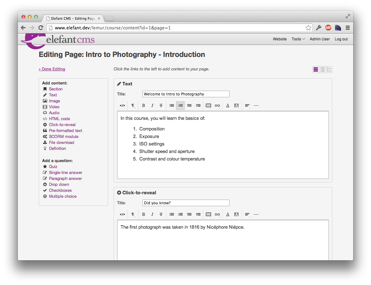 A course builder and delivery app for the Elefant CMS. A free and simple way to publish and host your own courses that keeps you in control.