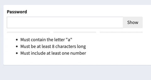 <?php use eluhr\passwordInput\widgets\PasswordInput; use yii\helpers\Html; use yii\widgets\ActiveForm; $form = ActiveForm::begin(); echo $form->field($model, 'password')->widget(PasswordInput::class, [ 'buttonLabelShow' => \Yii::t('password-input', 'Show'), 'buttonLabelHide' => \Yii::t('password-input', 'Hide'), 'layout' => "{input}\n{bars}\n{summary}", 'loadRulesFromModel' => false, 'rules' => [ [ 'text' => 'Must be at least 8 characters long', 'pattern' => '/[0-9a-zA-Z]{8,}/' ], [ 'text' => 'Must include at least one number', 'pattern' => '/\d+/' ], [ 'text' => 'Must contain the letter "a"', 'pattern' => '/a/', 'showAsBar' => false ], [ 'text' => 'Must not be empty', 'pattern' => '/.+/', 'showInSummary' => false ] ], 'showPasswordByDefault' => false, 'showShowPasswordButton' => true ]); echo Html::submitButton(); ActiveForm::end(); ?>