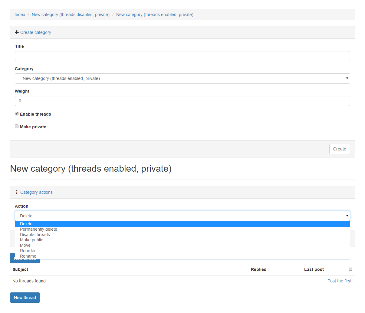 Once the package is installed, provided you are logged in, you can visit /forum and start defining your category hierarchy using the "Create category" and "Category actions" panels: