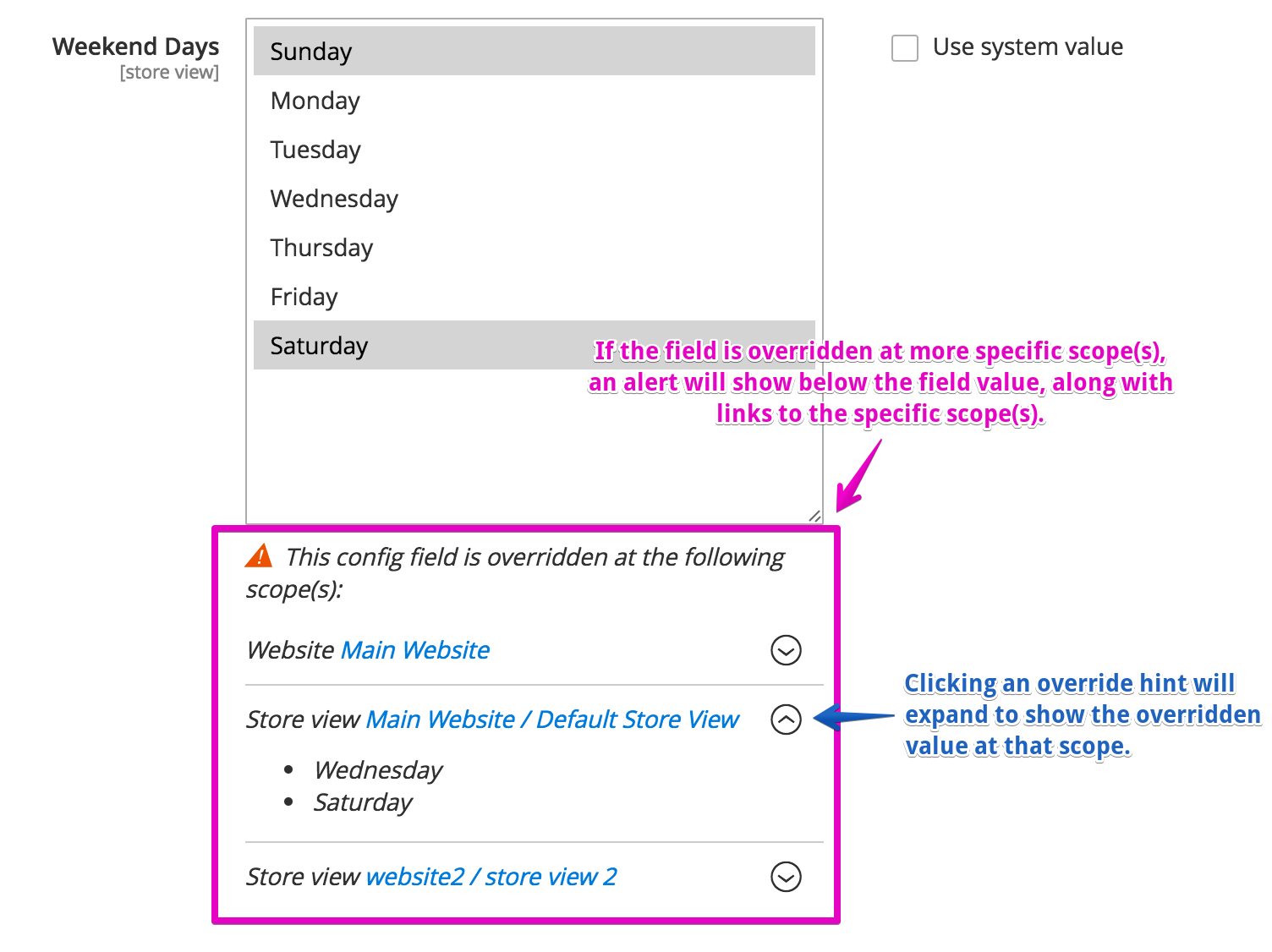 Along with the alert message, a detailed list of the exact scope(s) that override the value, with links directly to the store config for the current section at those scopes. Clicking an override hint row arrow will expand the row to also show the field's value at that scope.