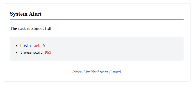 Alert::send('System', 'The disk is almost full', [