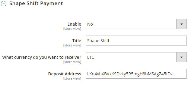 Now, let’s tell a few words about the backend configuration of the Firebear Magento 2 ShapeShift extension. Everything is even easier here. From the perspective of a store administrator, the configuration of the ShapeShift Magento 2 extension doesn’t takes too much time and effort. All the necessary settings are available under Stores -> Settings -> Configuration -> Sales -> Payment Methods -> Other Payment Methods. There is a new payment method called ‘Shape Shift Payment’. The appropriate tab allows you enabling the extension and selecting the desired cryptocurrency you want to get after the payment is processed. The ShapeShift Magento 2 module supports all existing altcoins. Of course, you can select Bitcoin or Ethereum as a basis of all operations, but the plugin offers much wider opportunities. Next, specify a wallet deposit address. Remember that it must be related to the specified coin type.