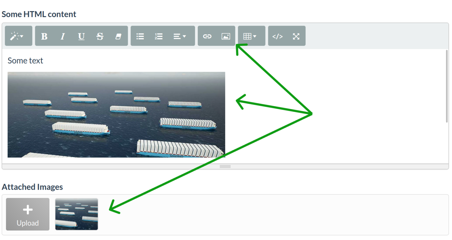 $form = ActiveForm::begin(); echo $form->field($model, 'content_ru') ->widget(Summernote::class, [ 'fileField' => 'imagesDesktop', 'fileModelClass' => $model::class ]); echo $form->field($model, 'imagesDesktop') ->widget(FileInputWidget::class); ActiveForm::end();