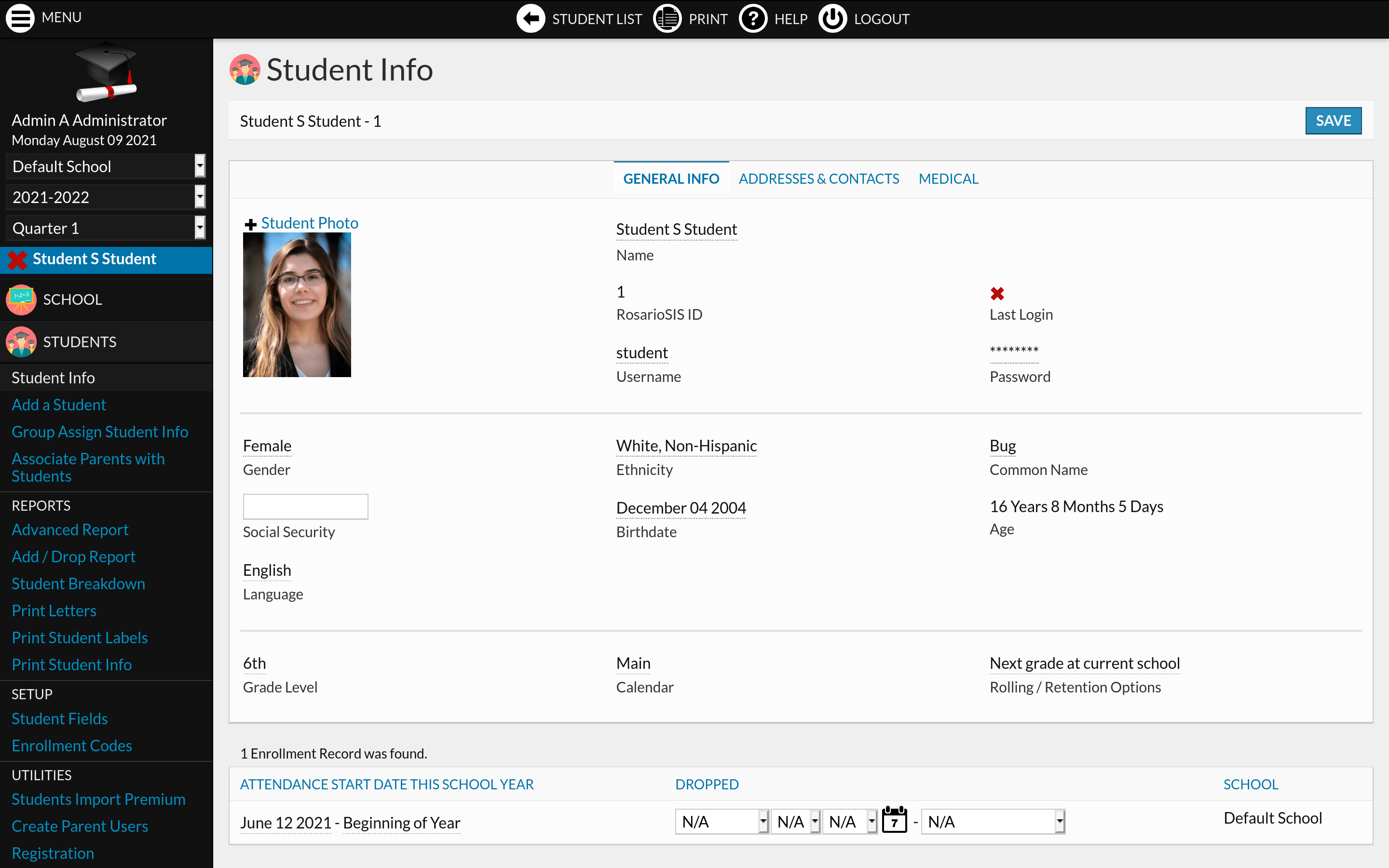 You will find RosarioSIS to be a full-featured Student Information System that facilitates your decision-making, provides data necessary for reports to the federal or state governments as well as local boards, and affords convenient access to all of the stakeholders in your building or district. And, because it is web-based, the system can be logged into from any Internet connection.