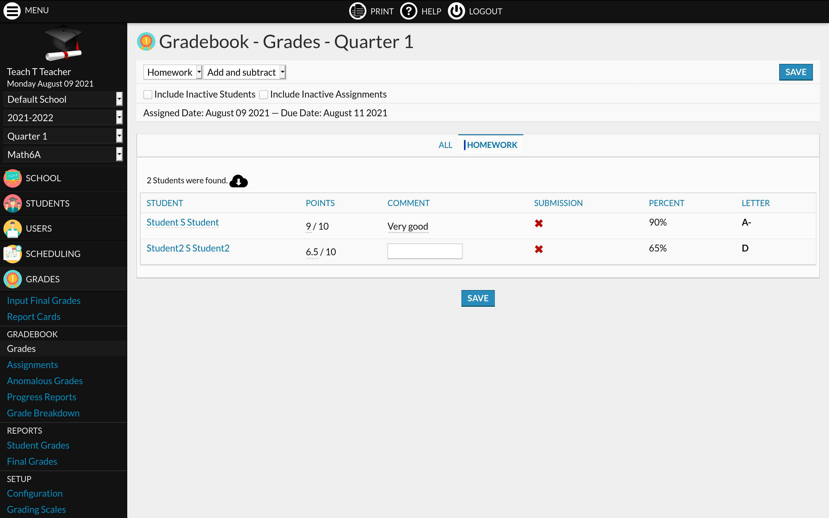 • A comprehensive grade book that allows teachers to establish grade ranges, weight assignments, track assignments, and issue quarterly and semester grades as well as progress reports. Report card and transcripts are also available. Furthermore, report cards and transcripts can be configured to display grades for any or all of your schools marking periods on the fly.