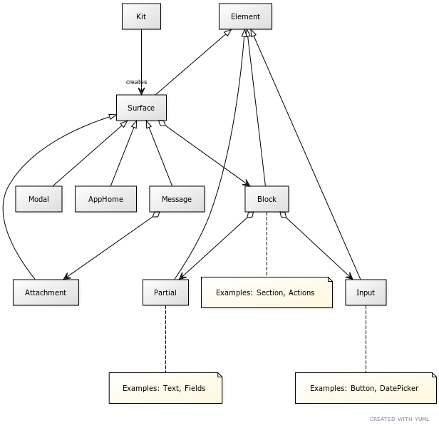 This library supports an intuitive and fluid syntax for composing Slack surfaces (e.g., messages, modals). The Kit