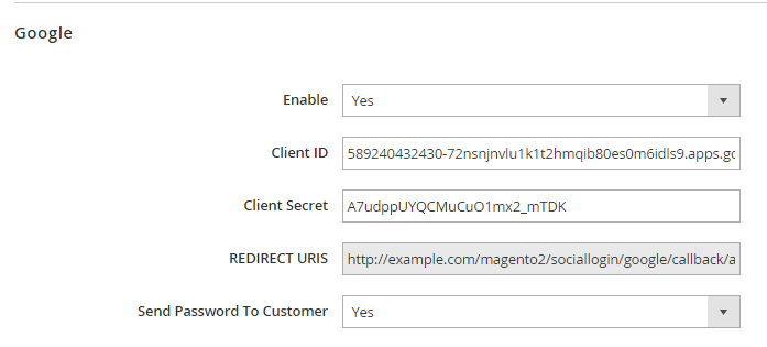 If customers login via Google, you can send email notification about their account’s password on your site or not, that depends on setting in Send Password to Customer field.