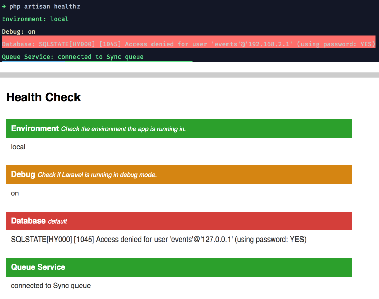 use Gentux\Healthz\Healthz; use Illuminate\Support\ServiceProvider; use Gentux\Healthz\Checks\General\EnvHealthCheck; use Gentux\Healthz\Checks\Laravel\DatabaseHealthCheck; class AppServiceProvider extends ServiceProvider { public function register() { $this->app->bind(Healthz::class, function () { $env = new EnvHealthCheck(); $db = new DatabaseHealthCheck(); $db->setConnection("non-default"); return new Healthz([$env, $db]); }); } }