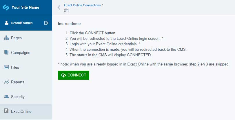 After installation and configuration go to Exact Online in the main menu of the CMS and follow the instructions to connect. Or let your customer do this by themselves as accounting software is very privacy of course, then you don't need to ask for the their credentials.