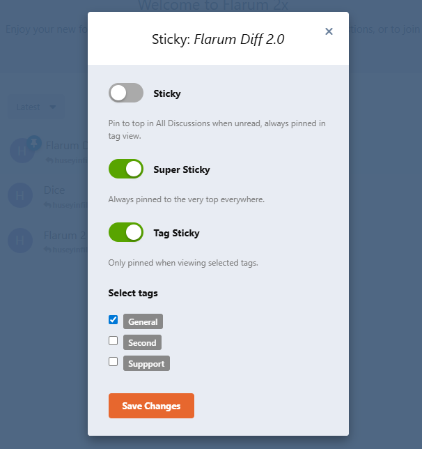 This extension allows you to stick, super-stick, or tag-stick discussions to the top of the list. It is fully compatible with Flarum 2.x and is inspired by the-turk/flarum-stickiest, but entirely rewritten from scratch.
