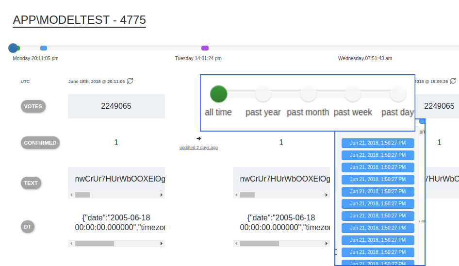 When you click on the ID of the Model, you are able to see the all time history of the selected ID. If the highlighted history is too far apart to read or there are too many events, then you can slide the top right slider for a more appropriate timeline. You can also hover highlighted sections, which represent an event that took place in the model's timeline.