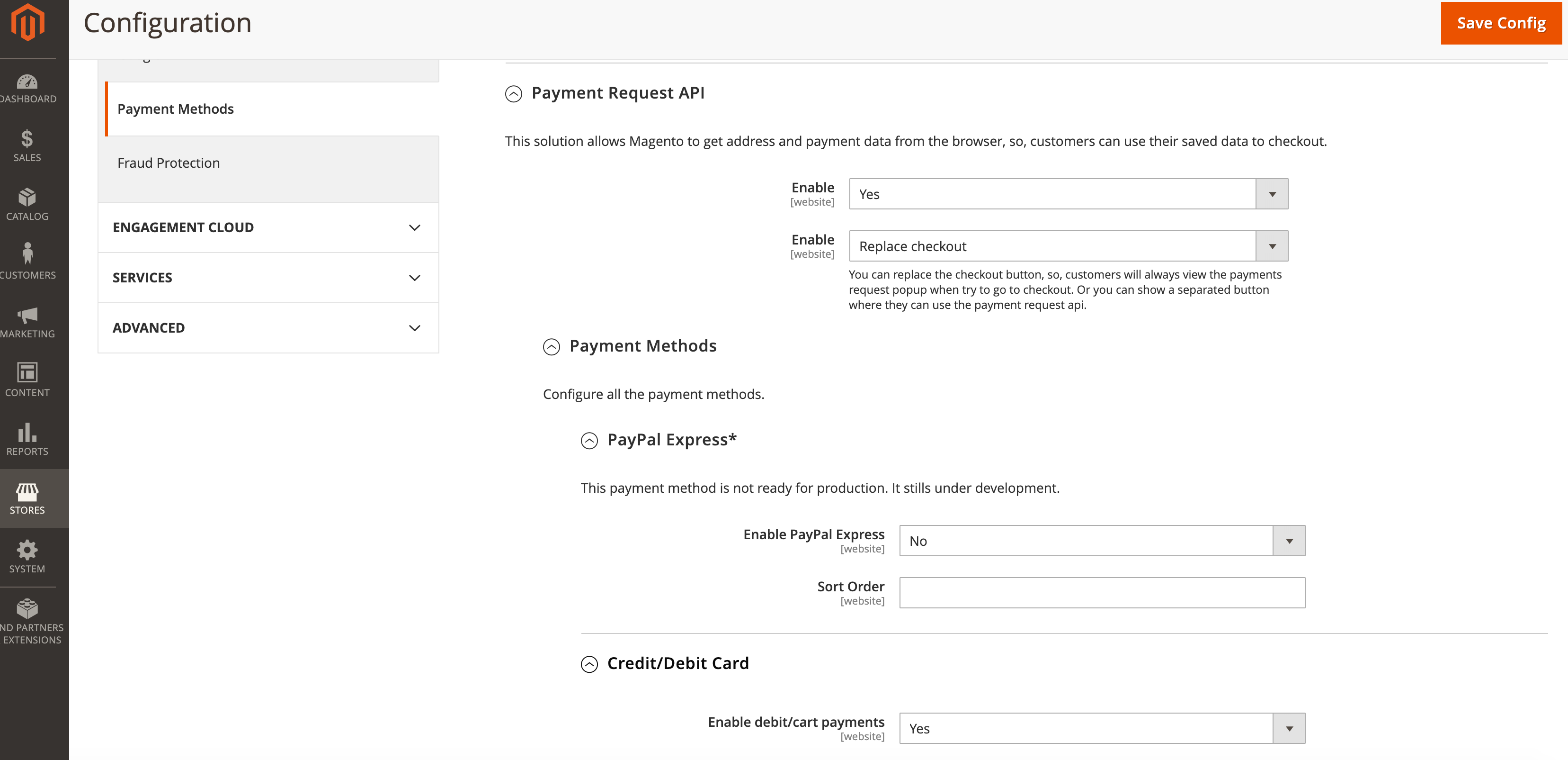 The Debit/Credit card option can be integrated with any payment provider, at this point we have Braintree ready to be used. In the Payment Request Api config there is an option where we choose the Magento payment method that will be used to process the debit/credit cart payments.