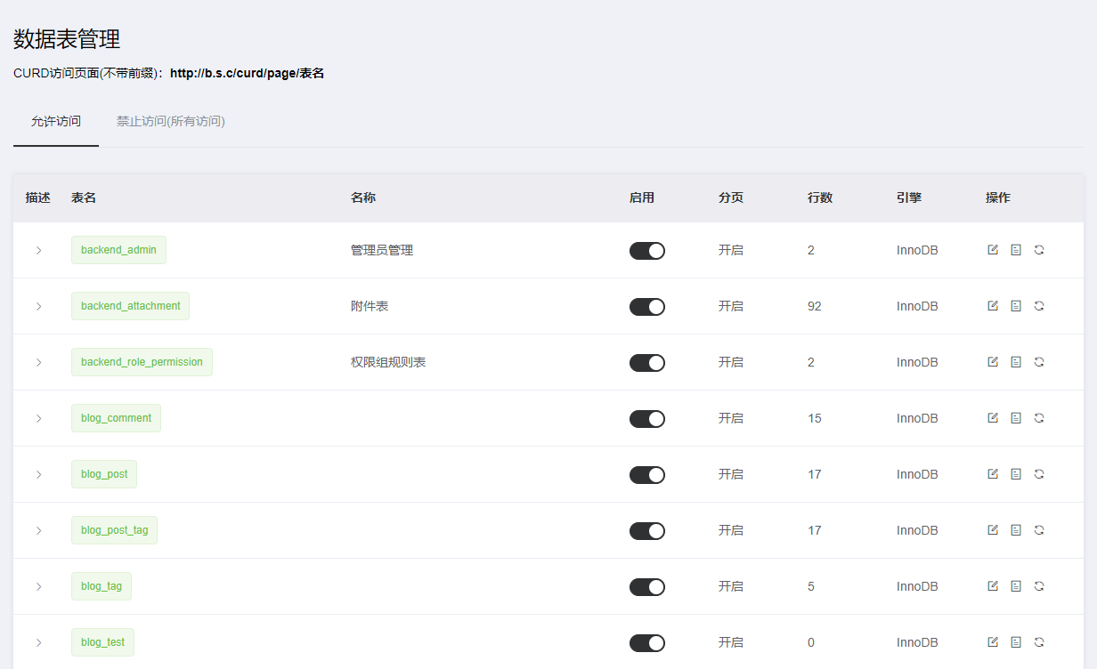 2、访问 http://域名/curd (路由前缀配置查看config/curd.php配置文件route_prefix)