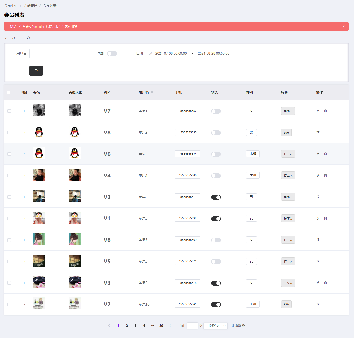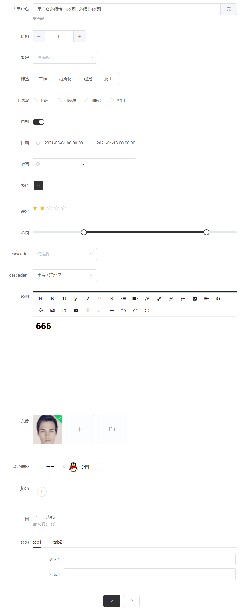<?php // Table组件示例 $tbales = [ new selection("id"), (new Column('id', '普通组件'))->props('width', '50px'), (new Expand('address', '折叠'))->scopedSlots( [ (new Component())->el('span') // 【重要】将当前列字段address的值注入innerHTML,需要注入到多个属性使用 Array ->inject('domProps', 'innerHTML') ->style('width', '80px'), ] ), (new Column('status', '开关组件'))->scopedSlots( [ //支持url替换 {字段}替换成当前列参数 (new Switcher())->props(['async' => ['data' => ['id', 'a' => 'b'], 'method' => 'POST', 'url' => '/change/{id}/{username}']]), ] )->props('width', '150px'), (new Column('thumbnail', '自定义显示内容'))->scopedSlots( [ (new Component())->el('el-image')->inject('attrs', ['src', 'array.preview-src-list'])->style('width', '80px'), ] )->props('width', '100px'), (new Column('options', '操作'))->props('fixed', 'right')// 右侧浮动 ->scopedSlots( [ (new Button('el-icon-delete', '删除')) // 【重要】当前列_delete_visible的值为true时才显示按钮 ->visible('_delete_visible') //支持url替换 {字段}替换成当前列参数 ->createConfirm('确认删除数据?', ['method' => 'DELETE', 'data' => ['id'], 'url' => 'delete/{id}']), ] ), ]; // Form组件示例 $form = [ (new Input('username', '用户名')) ->input('username', '用户名', '用户名必须填,必须!必须!必须!') ->marker('要不得') ->validate( // 验证 支持页面验证+后台验证 [ ['required' => true, 'message' => '用户名必须'], ] ) // 无限级嵌套子组件 ->children([(new Component)->el('span')->item(false)->domProps(['innerText' => '元'])->slot('append')]), (new Hidden('Hidden', '说明')), (new Number('price', '价格'))->props('step', 5), (new Select('hobby', '爱好'))->select('hobby', '爱好')->options(self::formatOptions([1 => '干饭', '打麻将', '睡觉', '爬山']))->props('multiple', ! 0), (new Checkbox('label', '标签', []))->checkbox('label', '标签', []) ->options(self::formatOptions([1 => '干饭', '打麻将', '睡觉', '爬山'])) ->props('max', 2)->props('group', ! 0), //group = true button样式 false 普通样式 (new Radio('examine', '审核', 2))->options(self::formatOptions([1 => '干饭', '打麻将', '睡觉', '爬山'])) ->props('group', ! 1), //group = true button样式 false 普通样式 new Switcher('postage', '包邮', 0), (new Date('section_day', '日期'))->props( [ 'type' => "datetimerange", 'value-format' => "yyyy-MM-dd HH:mm:ss", ] ), (new Time('section_time', '时间'))->props( [ 'isRange' => ! 0, 'value-format' => "HH:mm:ss", ] ), new Color('color', '颜色', '#333333'), new Rate('rate', '评分', 2), (new Slider('slider', '范围', [15, 27]))->props(['min' => 10, 'max' => 30, 'range' => ! 0]), (new Tree('tree', '树'))->props( [ 'type' => 'checked', 'defaultExpandAll' => ! 0, 'checkOnClickNode' => ! 0, 'expandOnClickNode' => ! 1, 'multiple' => ! 0, 'showCheckbox' => ! 0, 'data' => [ [ 'id' => 1, 'title' => 'a', 'expand' => ! 0, 'selected' => ! 1, 'children' => [ [ 'id' => 101, 'title' => 'a1', 'expand' => ! 0, 'children' => [ [ 'id' => 10101, 'title' => 'a11', ], ], ], ], ], ], 'props' => ['label' => 'title'], ] ), new Editor('content', '说明', '<h1>666</h1>'), (new Number('pricea', '我是惊喜', 2))->marker('惊不惊喜')->props('step', 5) ->visible([['prop' => 'priceb', 'value' => 10],]), // 字段显示条件配置 (new Number('priceb', '价格', 8))->marker('把我加到10有惊喜'), ]; // 自定义组件和全局事件绑定 $mixin = <<<JS <script> // 全局混入事件 Vue.mixin({ methods: { hello() { alert("全局混入事件") // \$surfaceForm 是surfaceForm API对象 \$surfaceForm.change(this.prop, 'ok') } } }) // 自定义组件 注册world组件 surfaceForm.component({ name: 'world', events: { // 参数初始化时(组件未注册)调用 onInit(c) { console.log('surfaceForm自定义组件配置初始化') } }, component: { name: 'world', props: { label: String, prop: String, value: [String], model: Object }, render(h) { return h("el-button", { on: { click() { alert('surfaceForm组件注册') } } }, this.value) } } }) </script> JS; // 注册js资源 $form->addScript($mixin); // 点击事件绑定hello方法 $form->column('button','绑定事件','')->el('el-button')->on('click', 'hello')->children(["全局混入事件"]), $form->column('world','自定义组件','surface-form自定义world组件')->el('world'),