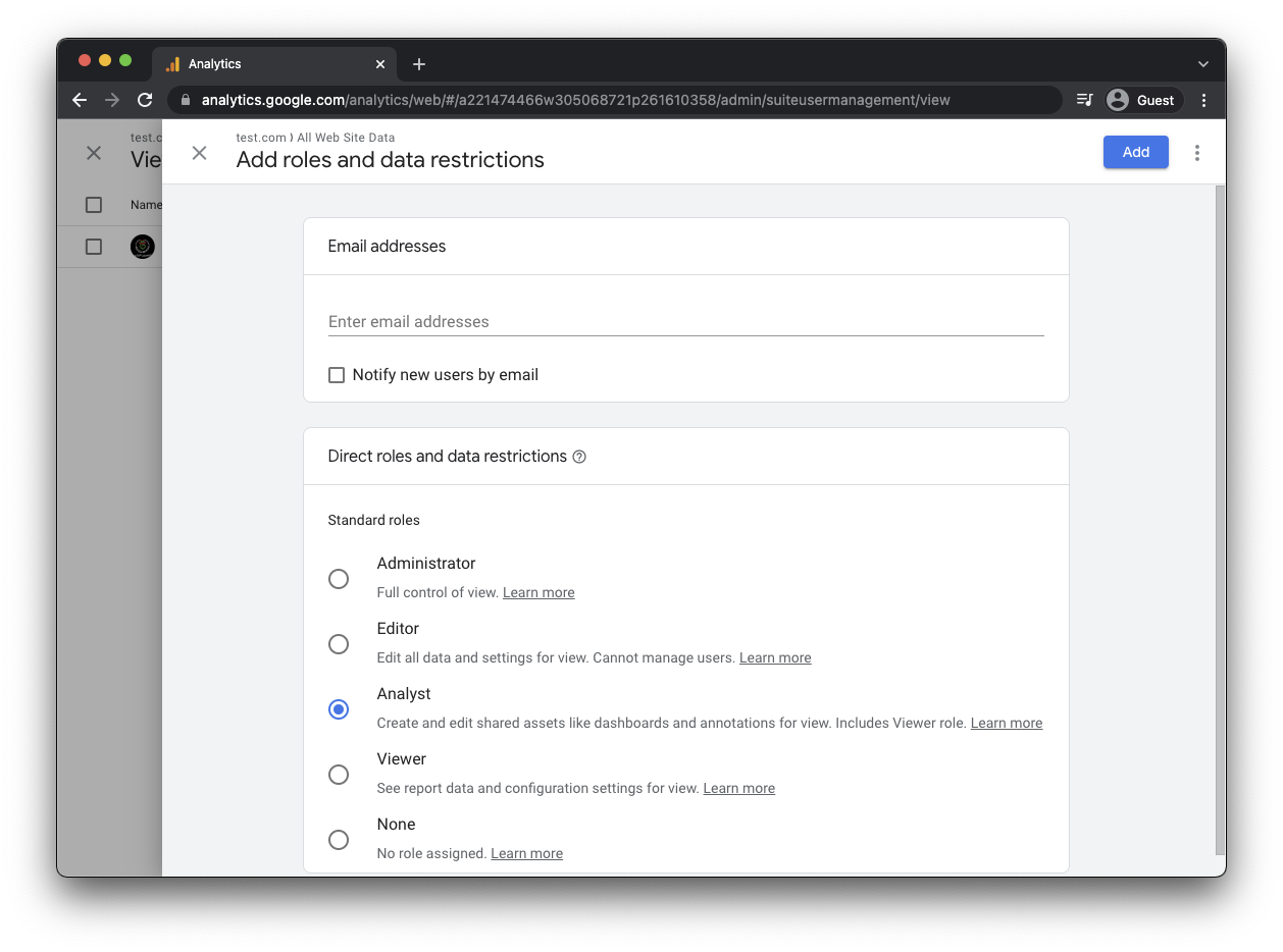Granting permissions to your Analytics property