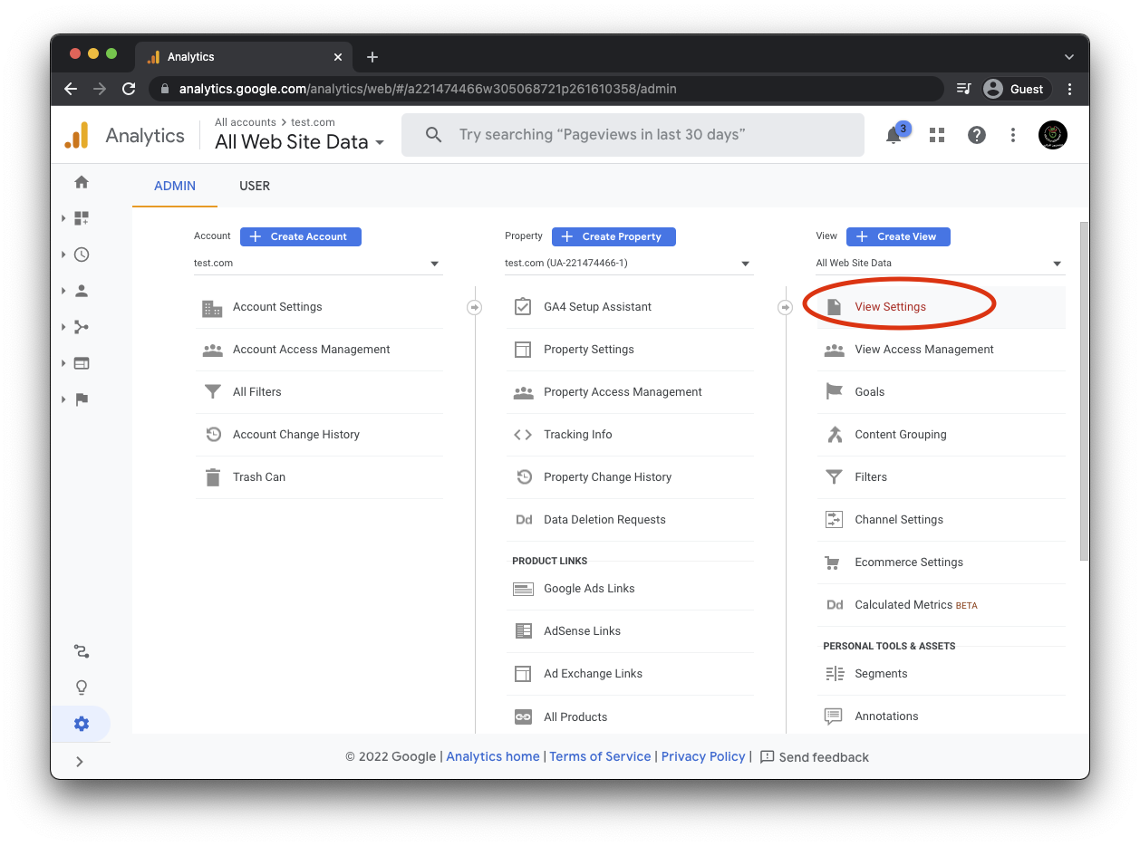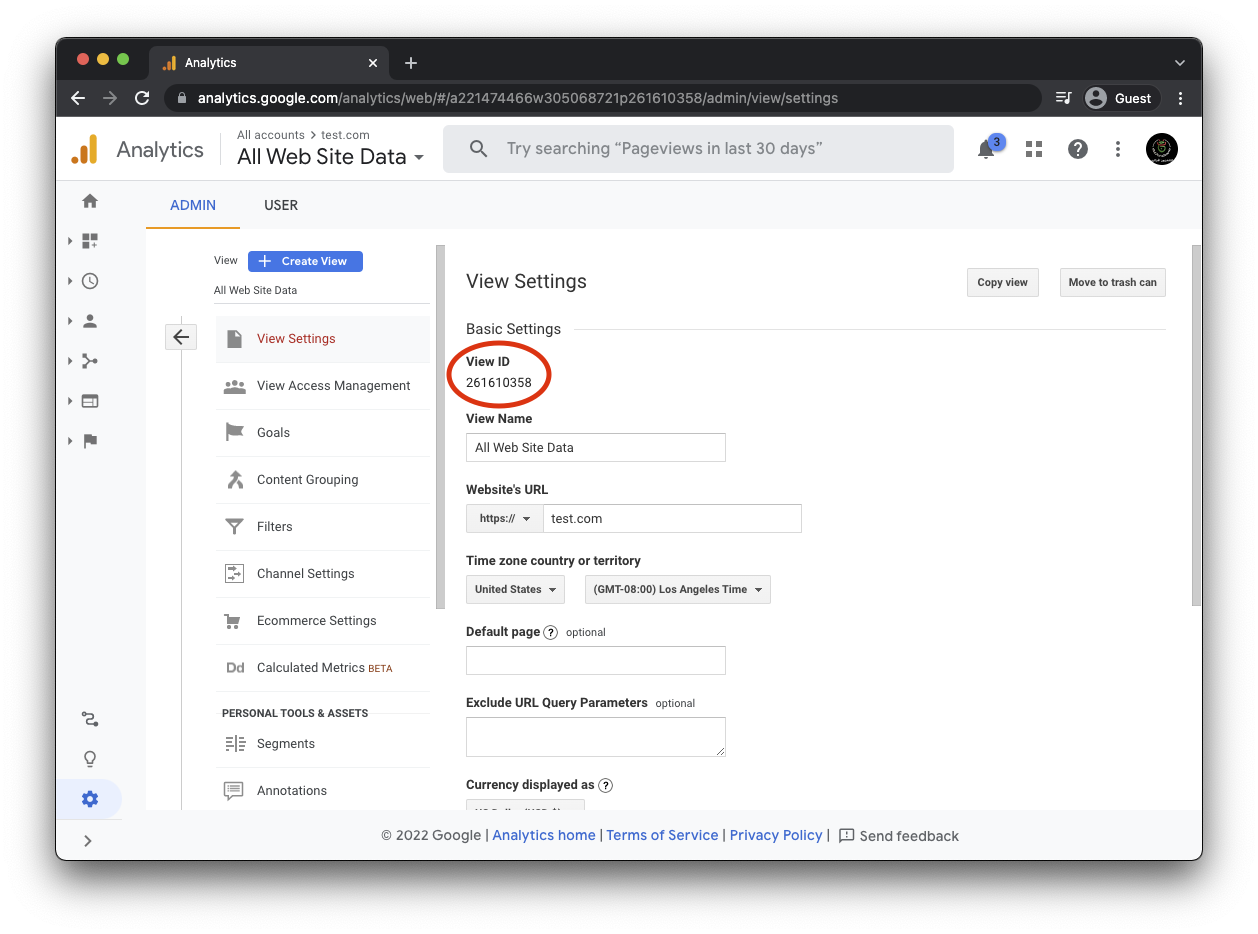The last thing you'll have to do is fill in the view_id in the config file. You can get the right value on the Analytics site. Go to "View setting" in the Admin-section of the property.