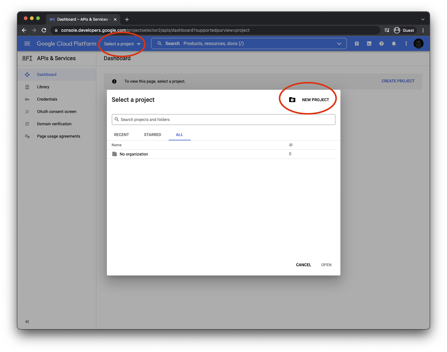 The first thing you’ll need to do is to get some credentials to use Google API’s. I’m assuming that you’ve already created a Google account and are signed in. Head over to Google API’s site and click "Select a project" in the header.
