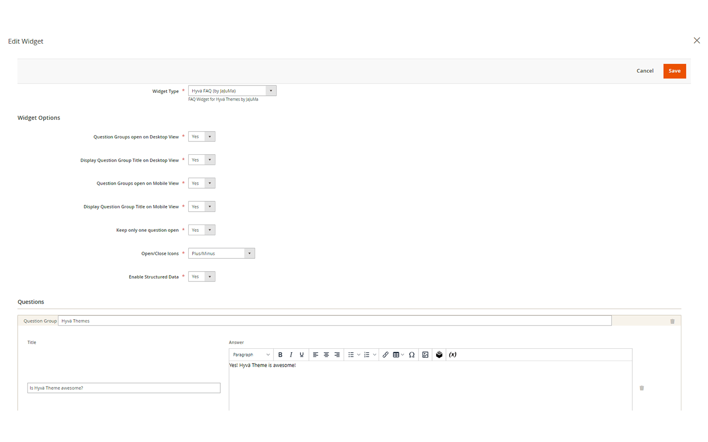 Adding a FAQ section in Magento with Hyvä Themes using JaJuMa "Hyvä FAQ Widget"