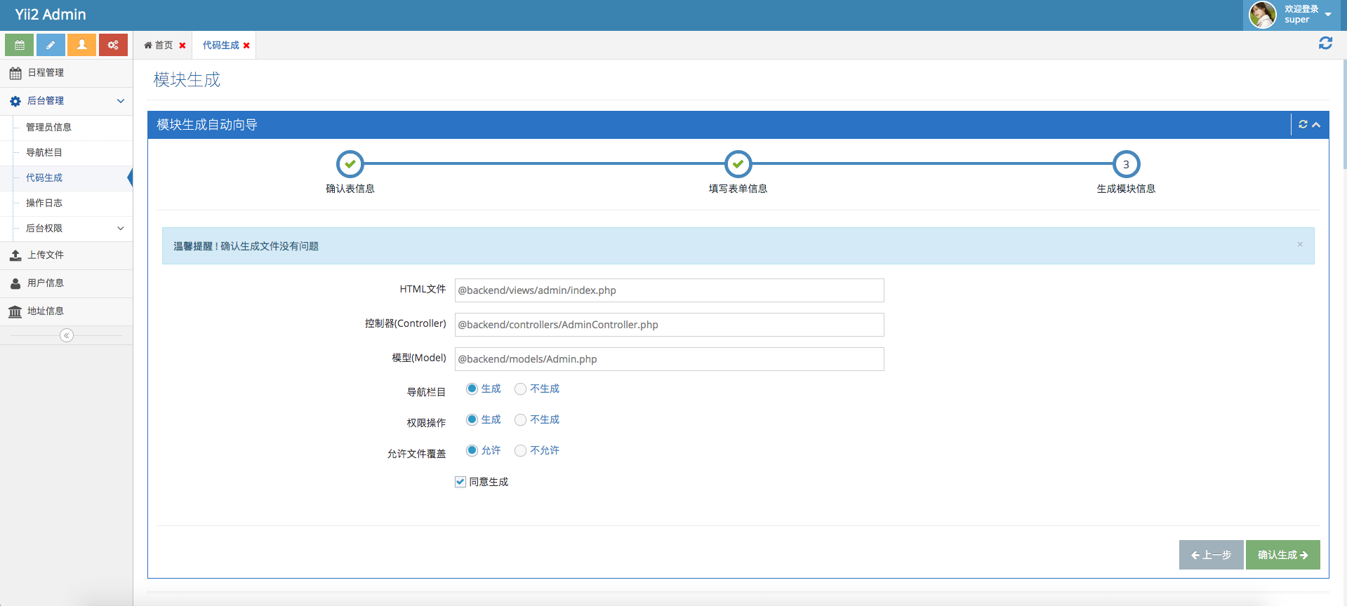 使用的 ace admin 前端框架, 为yii2开发的一个后台模块;