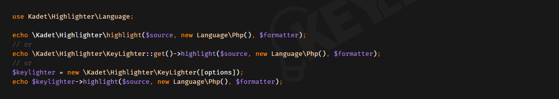 use Kadet\Highlighter\Language; echo \Kadet\Highlighter\highlight($source, new Language\Php(), $formatter); // or echo \Kadet\Highlighter\KeyLighter::get()->highlight($source, new Language\Php(), $formatter); // or $keylighter = new \Kadet\Highlighter\KeyLighter([options]); echo $keylighter->highlight($source, new Language\Php(), $formatter);