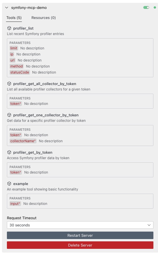 The bundle implements the MCP protocol directly, handling JSON-RPC requests and responses according to the specification. It exposes Symfony Profiler data through a set of tools that can be called by MCP clients (like AI assistants in your IDE).