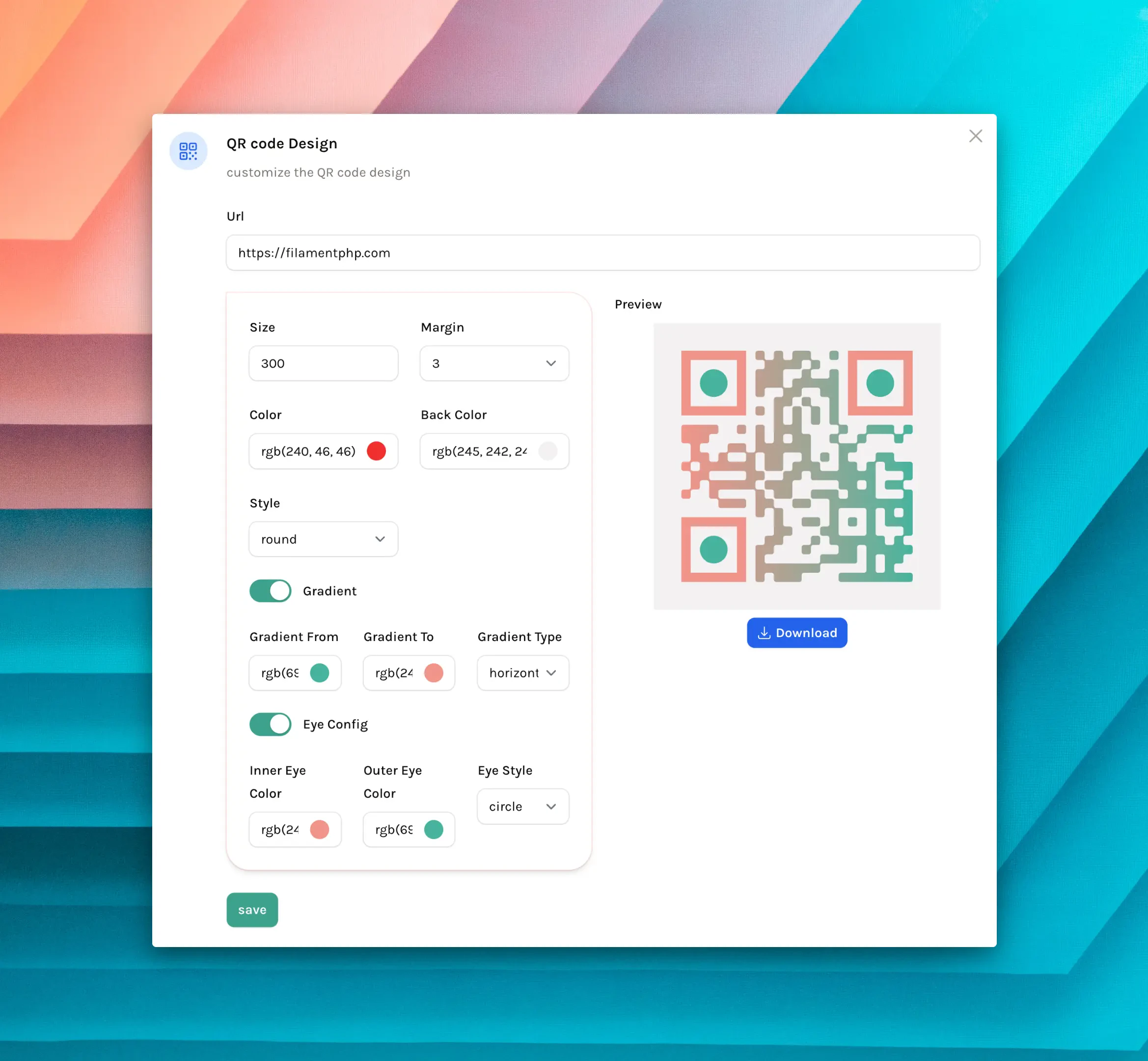 Zeus Qr Code Input to generate Qr Code with designing options for filamentPHP