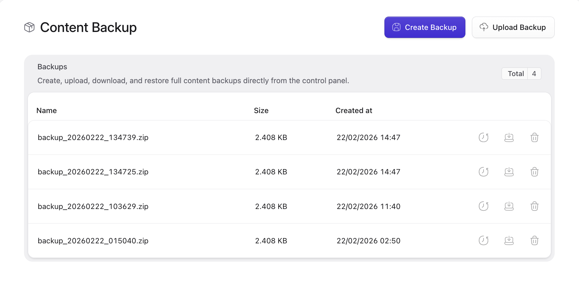 - Create and restore full content backups from the control panel