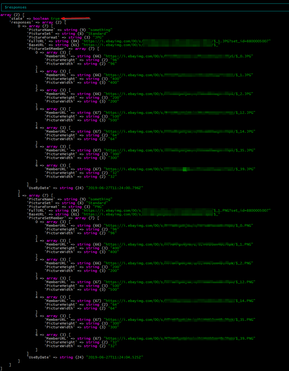 $images[] = file_get_contents('/tmp/img1.png'); $images[] = file_get_contents('/tmp/img2.png'); //$images[] = 'this should not work'; <-- test this so see how things fail $EbayUploadImages = new upload_images([ 'app-name' => 'xxxxxxxx', 'cert-name' => 'xxxxxxxx', 'dev-name' => 'xxxxxxxx', 'siteid' => 77, 'auth-token' => 'xxxxxxxx' ]); $responses = $EbayUploadImages->upload($images); d($responses);