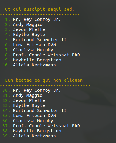 $this->softTitle('Ut qui suscipit sequi sed.'); foreach ($items as $item) { $this->line($this->getListIndex().$item); } $this->resetOrderedList(30); $this->softTitle('Eum beatae ea qui non aliquam.'); foreach ($items as $item) { $this->line($this->getListIndex().$item); }