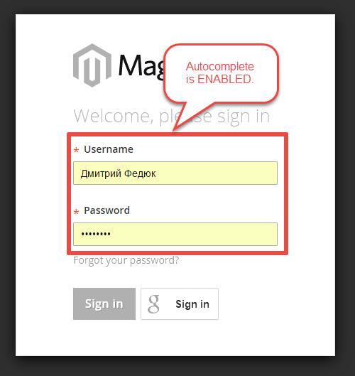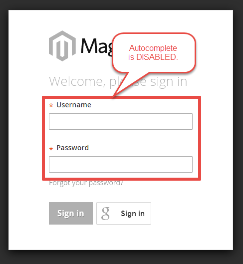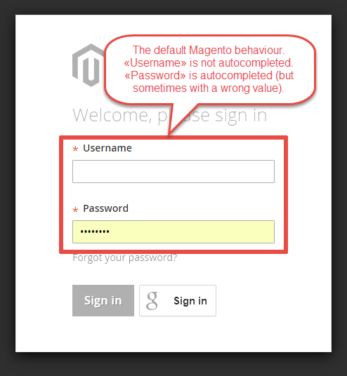 The «Backend Login Autocomplete» module for Magento 2 makes the standard Magento 2 backend login form more useful in modern browsers (like Google Chrome).