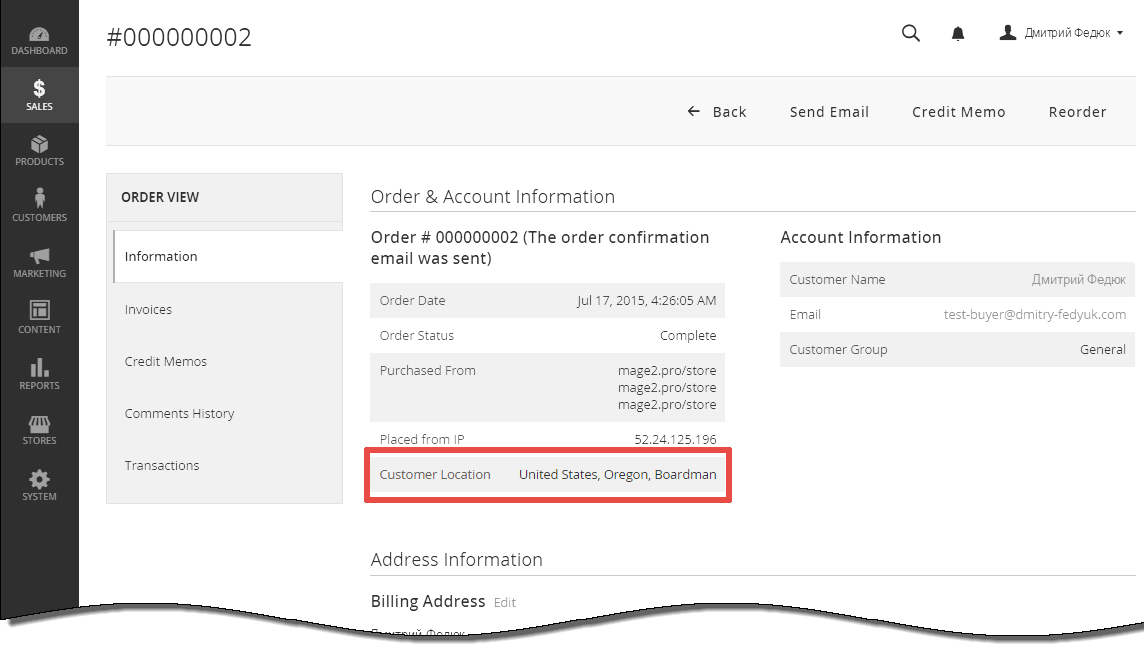 The «Customer Location» module for Magento 2 detects a customer location (based on IP address) when he is placing an order and shows the location on the admin order page. The module is free and open source.